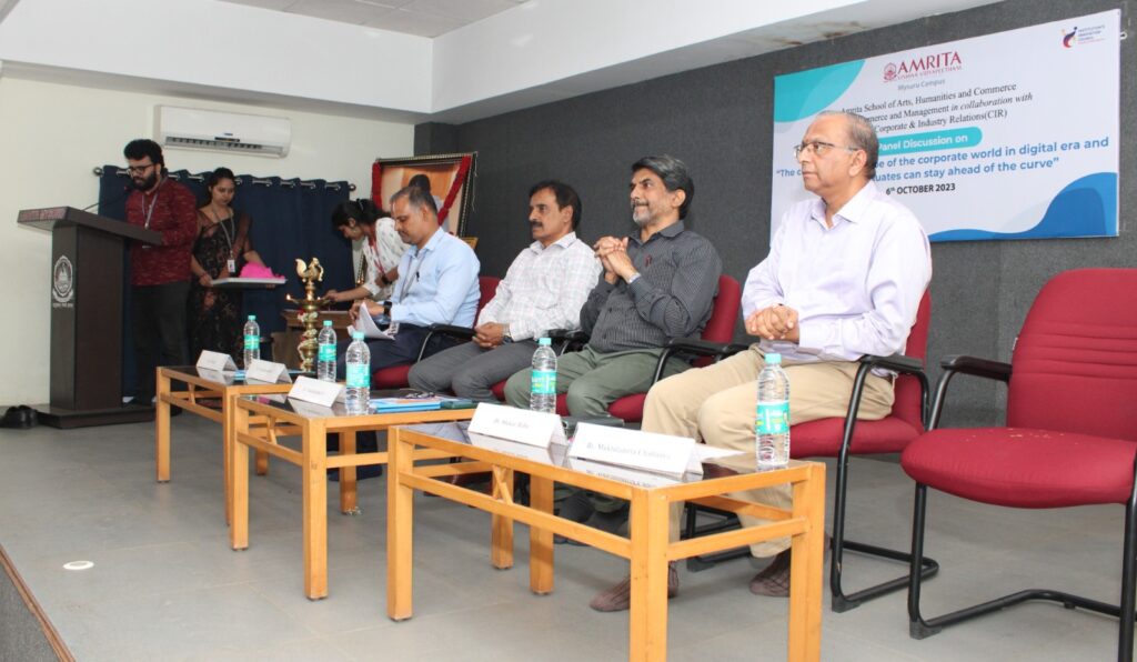 ಮೈಸೂರು: ಇಂದಿನ ಡಿಜಿಟಲ್ಯುಗದಲ್ಲಿ ಕಾರ್ಪೋರೇಟ್ ಉದ್ಯಮ ಬದಲಾಗುತ್ತಿರುವ ಪರಿ ಹಾಗೂ ಈ ಪ್ರಗತಿಗೆ ಪೂರಕವಾಗಿ ಇಂದಿನ ವಿದ್ಯಾರ್ಥಿಗಳು ಹೇಗೆ ತಮ್ಮ ವ್ಯಕ್ತಿತ್ವವನ್ನು ರೂಪಿಸಿಕೊಳ್ಳಬಹುದು ಎಂಬ ವಿಷಯದ ಕುರಿತು ಅಮೃತ ವಿಶ್ವವಿದ್ಯಾಪೀಠಂ, ಮೈಸೂರು ಕ್ಯಾಂಪಸ್ನಲ್ಲಿ ಪ್ಯಾನೆಲ್ ಡಿಸ್ಕಶನ್ ನಡೆಯಿತು. ಅಮೃತ ವಿಶ್ವವಿದ್ಯಾಪೀಠಂ ಮೈಸೂರುಕ್ಯಾಂಪಸ್ನ ವಾಣಿಜ್ಯ ಮತ್ತು ನಿರ್ವಹಣಾ ವಿಭಾಗ ಹಾಗೂ ಕಾರ್ಪೋರೇಟ್ &ಇಂಡಸ್ಟ್ರಿ ರಿಲೇಶನ್ಸ್ ವಿಭಾಗದಜಂಟಿ ಸಹಯೋಗದಲ್ಲಿ ಈ ಕಾರ್ಯಕ್ರಮ ಅಕ್ಟೋಬರ್ 6 ರಂದುಆಯೋಜಿಸಲಾಗಿತ್ತು.