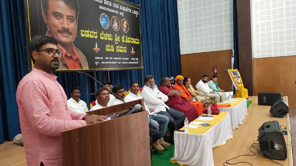 ನಗರದ ಜಿಲ್ಲಾಡಳಿತ ಭವನದ ಆವರಣದಲ್ಲಿರುವ ವರನಟ ಡಾ.ರಾಜ್ಕುಮಾರ್ ಜಿಲ್ಲಾ ರಂಗಮಂದಿರದಲ್ಲಿ ಛಲವಾದಿ ಮಹಾಸಭಾ ಹಾಗೂ ದಲಿತ ಸಂಘಟನೆಗಳ ಒಕ್ಕೂಟದ ವತಿಯಿಂದ ಆಯೋಜಿಸಿದ್ದ ಬಡವರ ಬೆಳಕು ಕೆ.ಶಿವರಾಂರವರ ಪುಣ್ಯಸ್ಮರಣೆ ನುಡಿನಮನ ಕಾರ್ಯಕ್ರಮದಲ್ಲಿ ಮಾತನಾಡಿದ ಅವರು, ಕೆಲವರು ಸಿನಿಮಾದಲ್ಲಿ ಬಂದ ಮೇಲೆ ಸ್ಟಾರ್ಗಳಾತ್ತಾರೆ. ಆದರೆ, ಕೆ.ಶಿವರಾಂ ಅವರು ಸಿನಿಮಾ ಮಾಡುವ ಮೊದಲೇ ಸ್ಟಾರ್ ಆಗಿದ್ದರು ಎಂದರು.